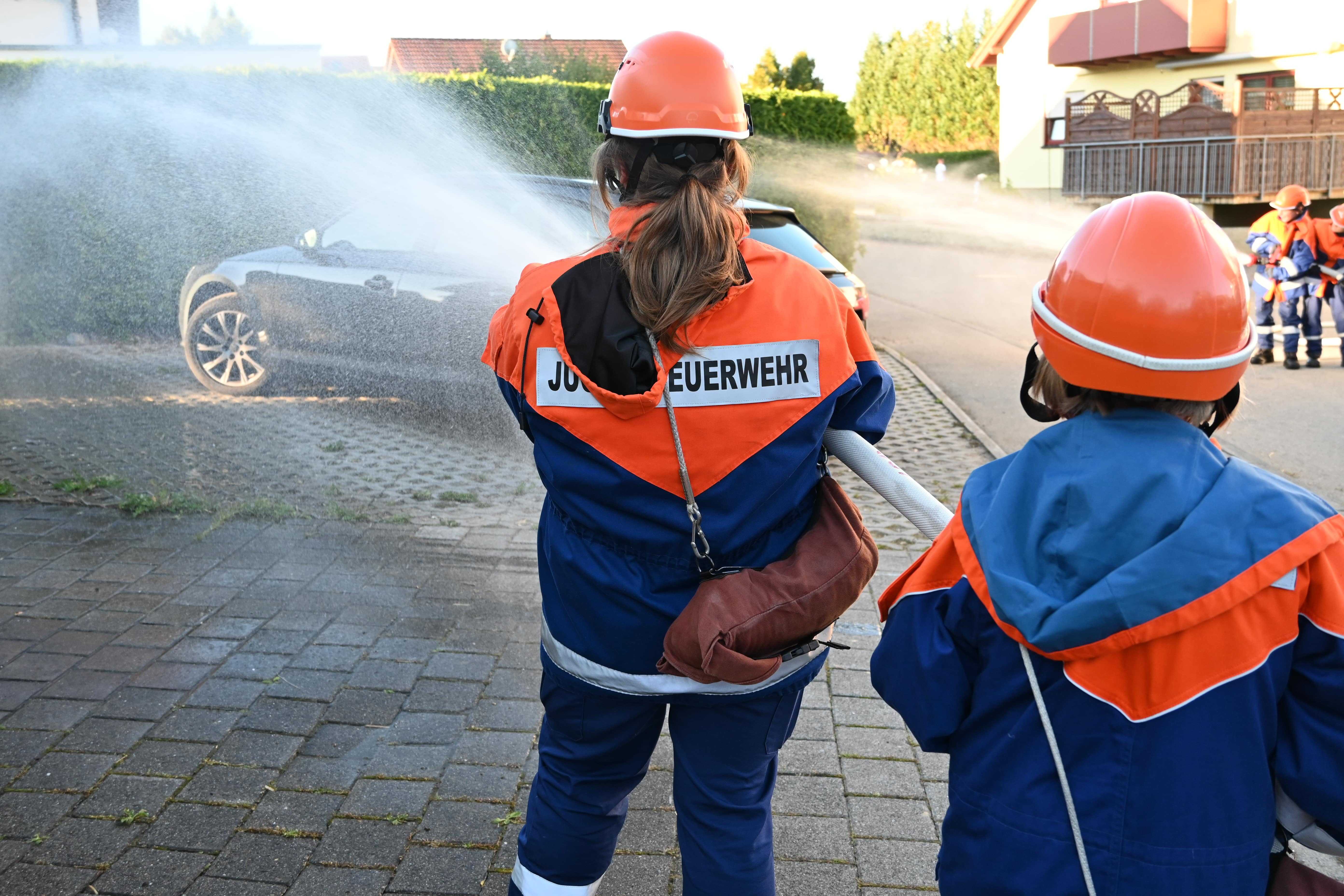 Den Auftakt machte die Jugendfeuerwehr mit einer beeindruckenden Übung. Angenommen wurde ein Brand eines PKW zwischen einer Garage und einer Hecke. Ziel war es, die Ausbreitung des Feuers auf umliegende Bereiche zu verhindern. Die jungen Feuerwehranwärterinnen und -anwärter setzten dabei drei Strahlrohre ein. Eines zum Schutz der Garage, ein zweites zur Abschirmung der Hecke, die bei einem realen Brand besonders gefährdet wäre, Ein drittes Rohr wurde zum Ablöschen des Fahrzeugs. Die Übung demonstrierte eindrucksvoll den Ausbildungsstand und das Engagement des Feuerwehrnachwuchses.
