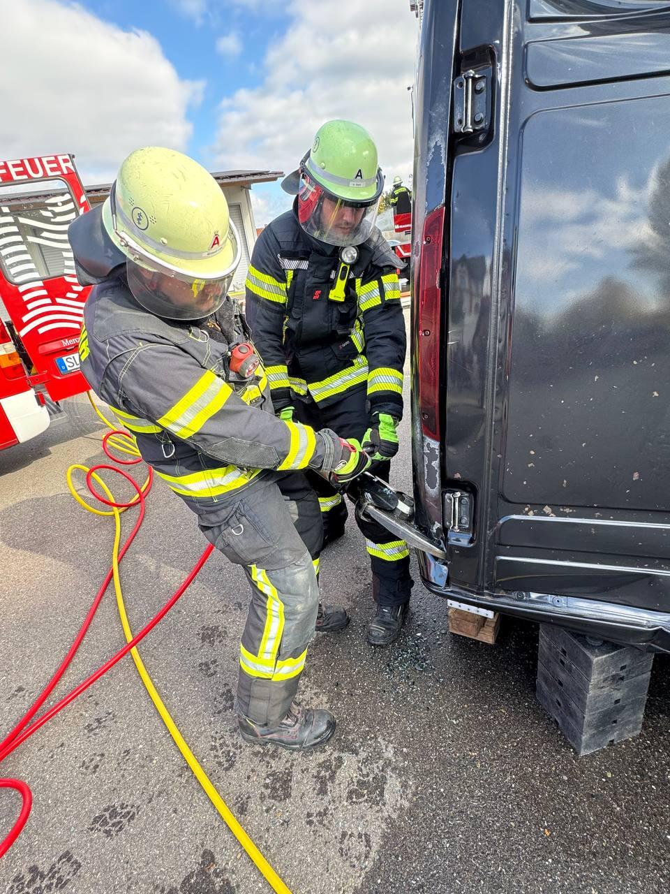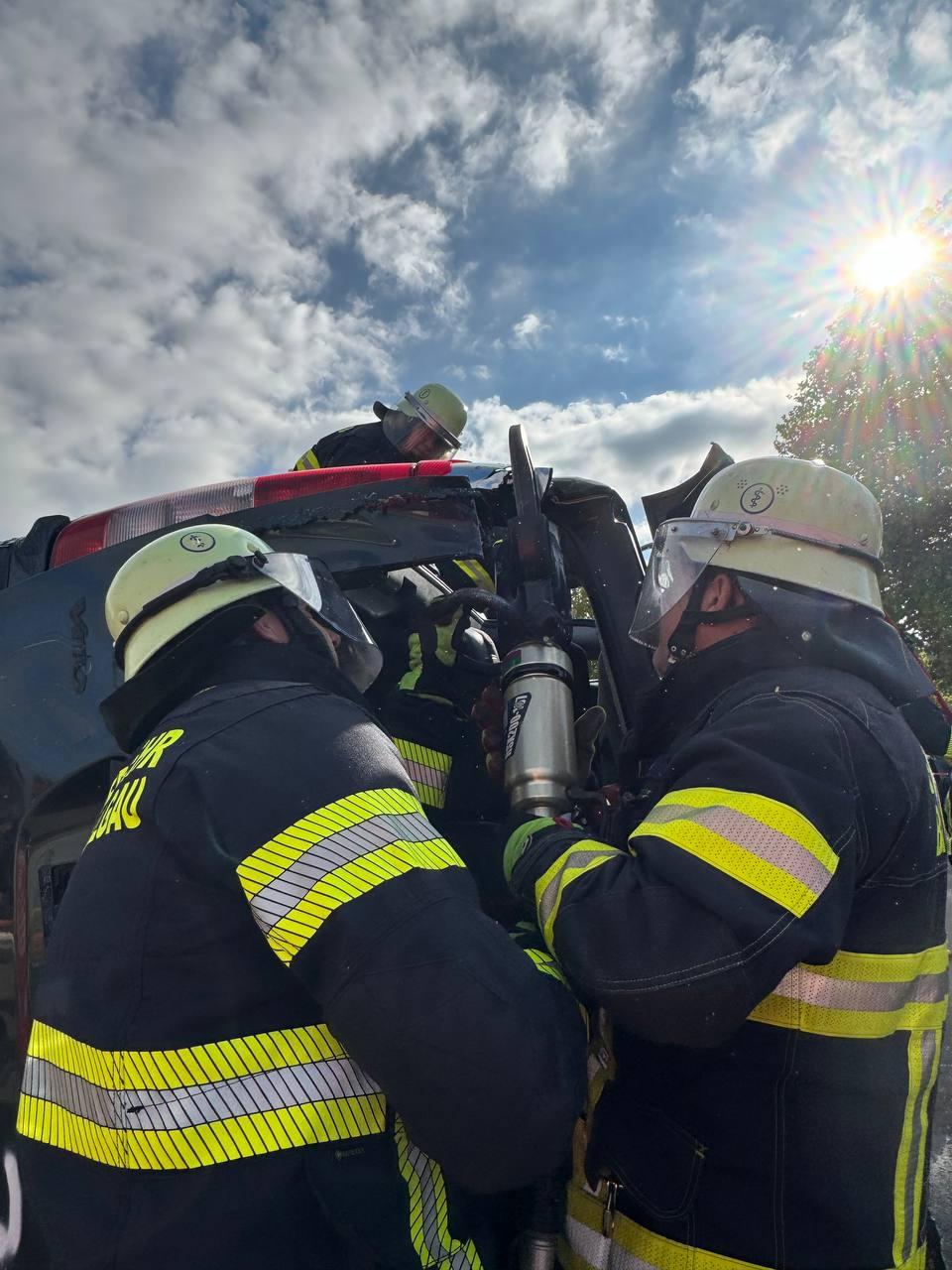 Mit dem Einsatzstichwort H4Y rückte die Feuerwehr Bad Saulgau mit Lösch- und Hilfeleistungszug an und begann sofort mit der Brandbekämpfung. Eine Riegelstellung wurde aufgebaut, die Drehleiter mit Wasserwerfer in Stellung gebracht und ein speziell ausgerüsteter Trupp näherte sich der brennenden Gasleitung, um die Zufuhr zu unterbrechen. Gleichzeitig arbeitete der Rüstzug an der technischen Rettung der Unfallopfer. Der verunfallte Vito wurde stabilisiert und angehoben, um die eingeklemmte Person zu befreien. Anschließend öffneten die Kräfte das Fahrzeugdach und retteten die übrigen Insassen, die vor Ort erstversorgt und dem DRK übergeben wurden. Die Führungsgruppe Bad Saulgau / Herbertingen behielt dabei jederzeit den Überblick und koordinierte den gesamten Ablauf.