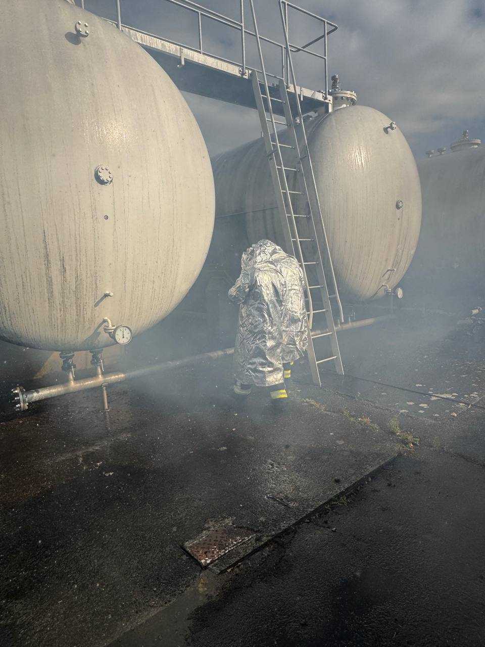 Im Anschluss folgte die Übung der Stützpunktwehr. Angenommen wurde ein schwerer Unfall bei Wartungsarbeiten an den Gastanks der Stadtwerke, bei dem plötzlich Gas austrat und sich entzündete. Eine meterhohe Flamme setzte die umliegende Bebauung unter akute Gefahr. Zeitgleich kam es zu einem weiteren Notfall: Ein in Panik reagierender Arbeiter fuhr mit einem Gabelstapler rückwärts und kollidierte mit einem Mercedes Vito, in dem sich mehrere Schülerinnen und Schüler befanden. Das Fahrzeug kippte auf die Seite, eine Person wurde eingeklemmt, die übrigen Insassen waren eingeschlossen.