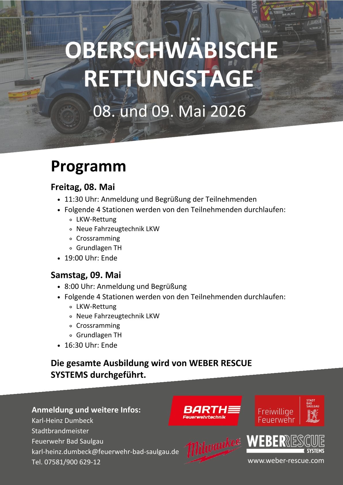 Gemeinsam mit WEBER RESCUE Systems und Barth Feuerwehrtechnik veranstaltet die Feuerwehr Bad Saulgau in diesem Jahr vom 08.05.2026 bis zum 09.05.2026 erneut die Oberschwäbischen Rettungstage – eine praxisnahe Fortbildungsveranstaltung für Einsatzkräfte aus der Region.